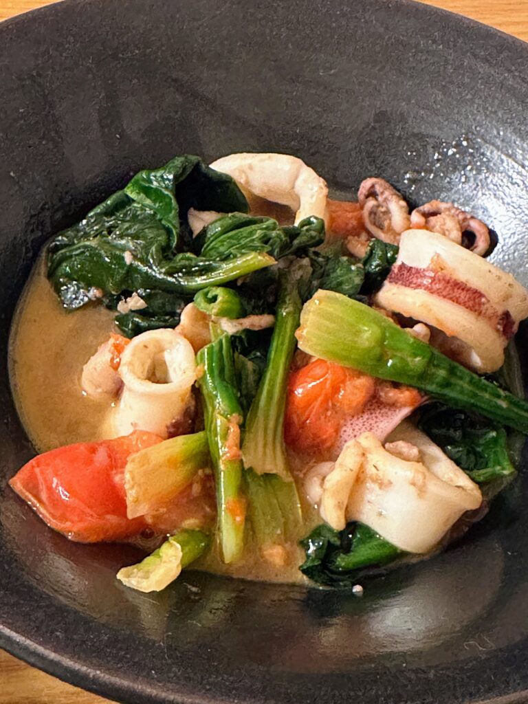 (いか、ホウレンソウ、トマトを炒めて煮た料理)
